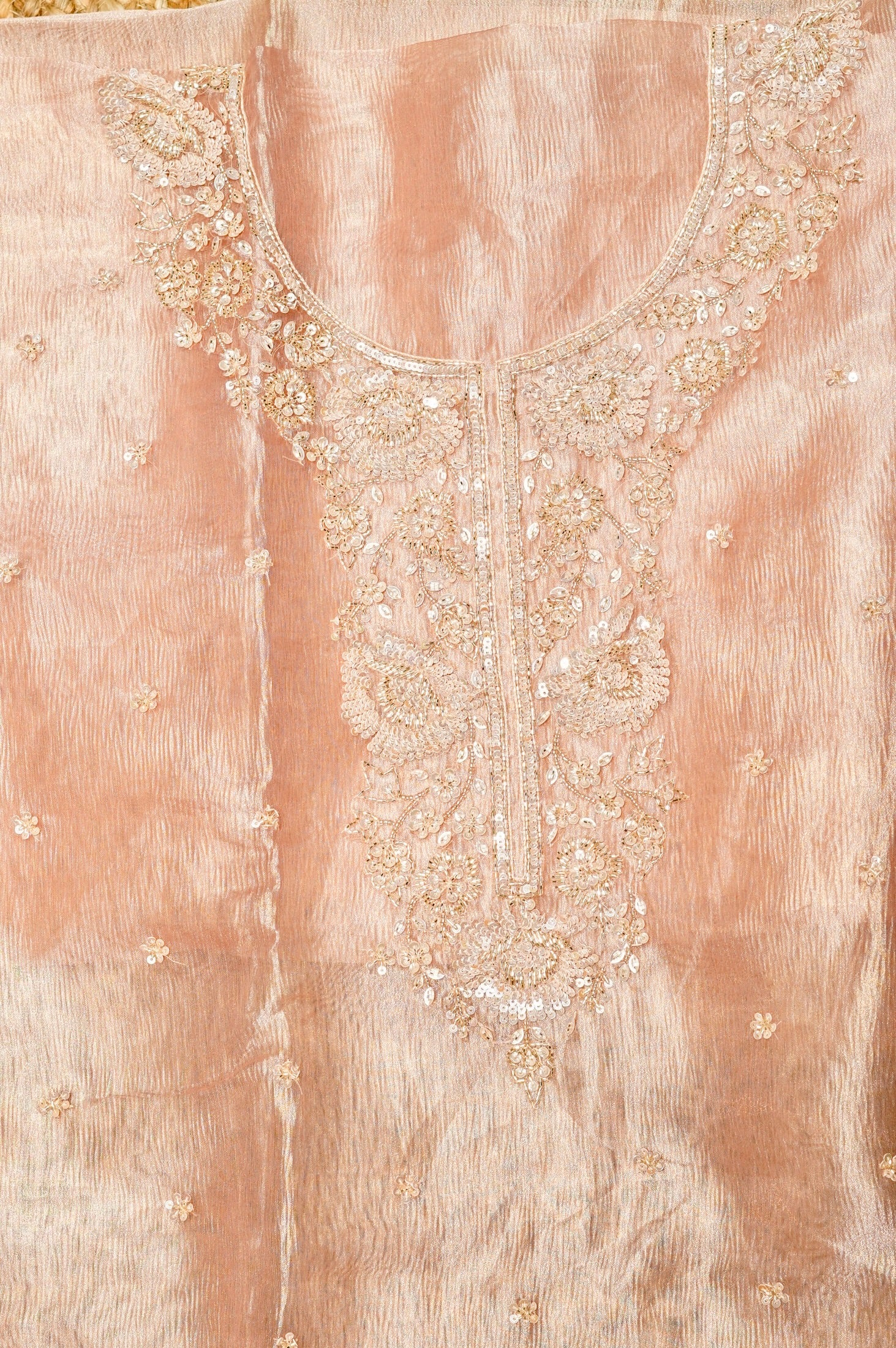 Crafted for a truly luxurious statement, this designer suit is a masterpiece of light and texture. The gold crush tissue fabric drapes with an ethereal shimmer, catching the light in a breathtaking dance. An exquisite display of artistry, the top is entirely adorned with meticulous handwork, a rich tapestry of intricate embellishments. This same detailed craftsmanship extends to the matching dupatta, ensuring a seamless, opulent look that radiates sophistication and elegance, making it perfect for your most special occasions.